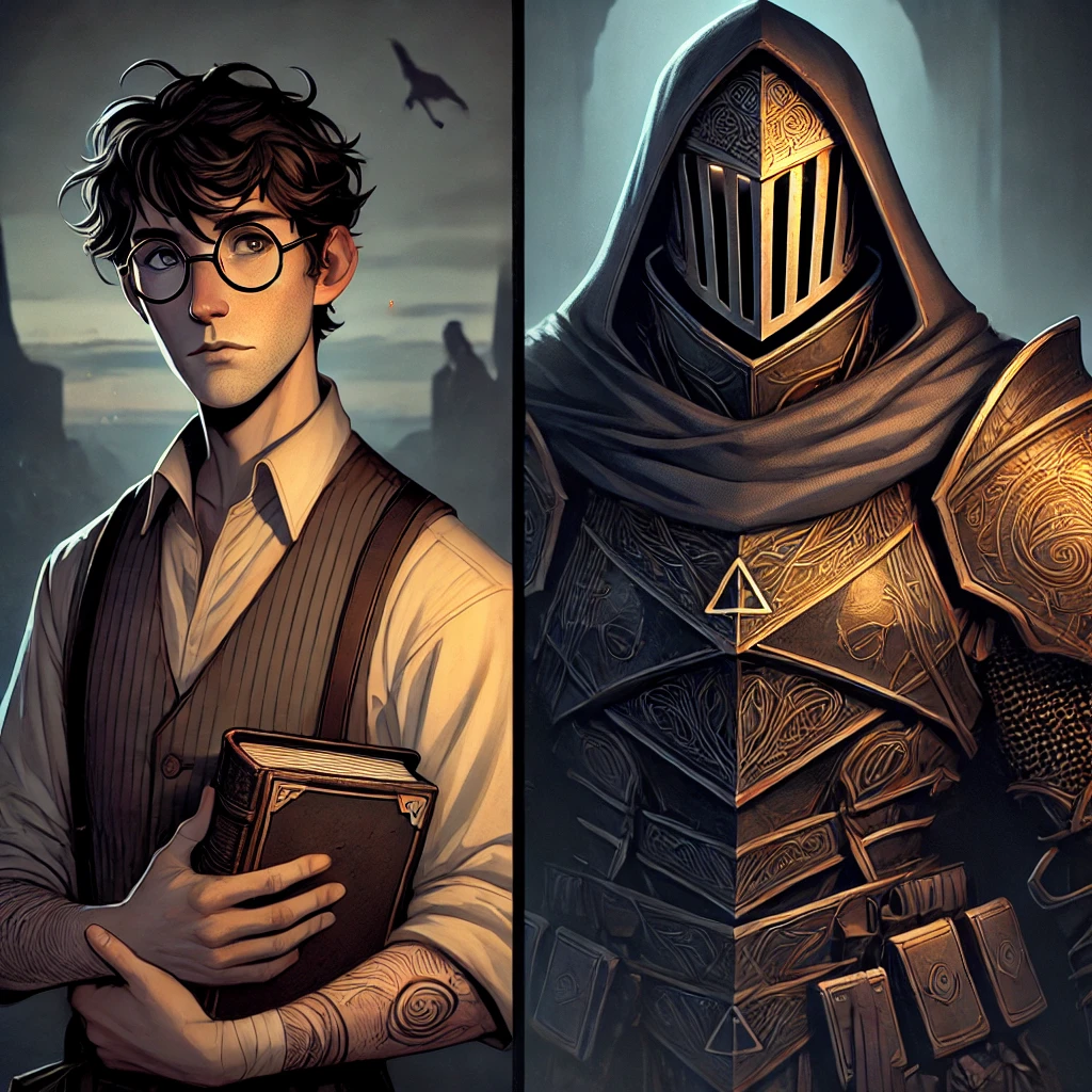 Imposing and precise when armored; shy and bookish out of armor. Intricate rune-scars are etched across his skin—the source of his supernatural strength when channeled through his harness and plate.