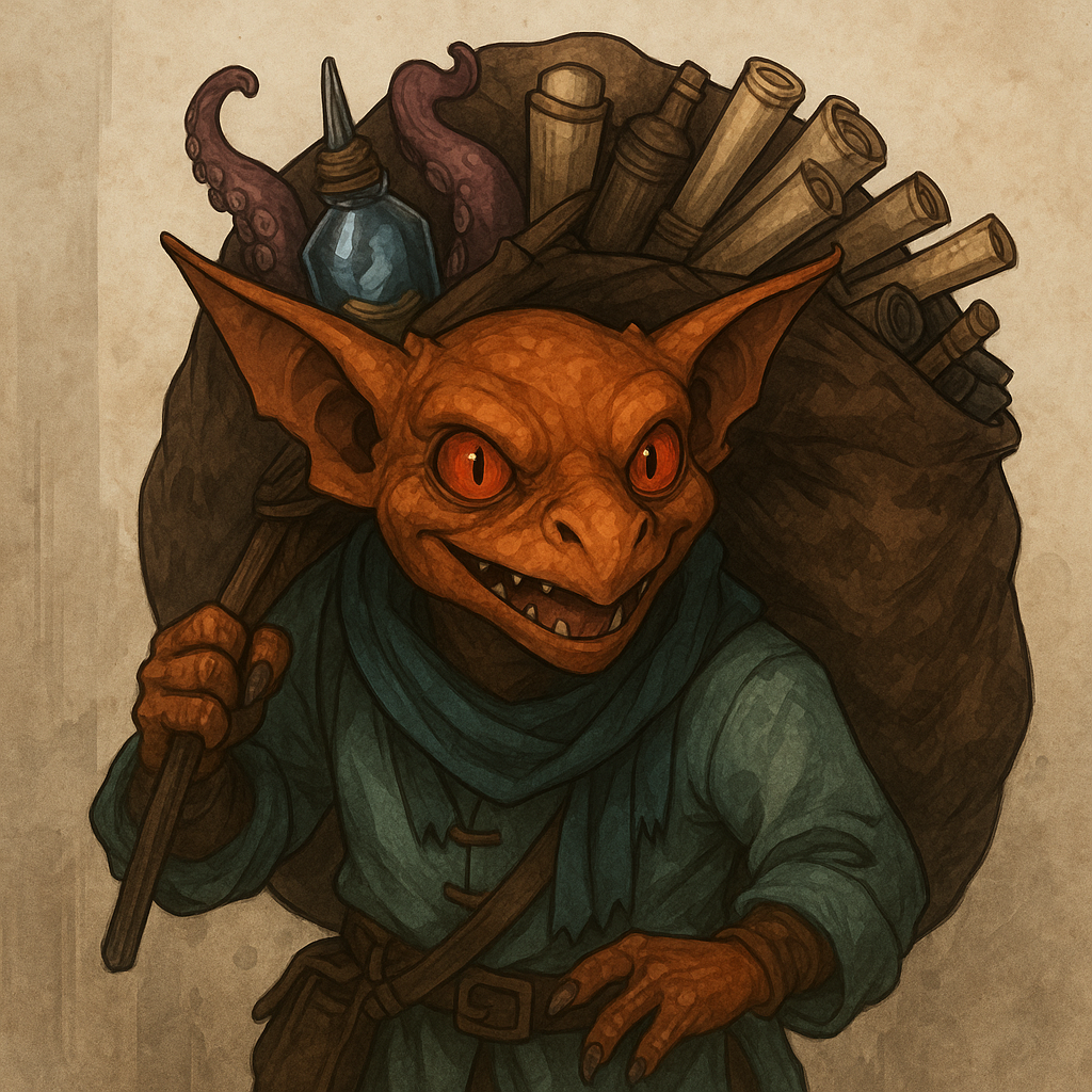 A small kobold carrying an enormous sack stuffed with strange magical trinkets, parts, and artifacts. Sharp-eyed and unusually perceptive. His demeanor shifts from cheerful salesman to eerily distant when under some unknown influence.